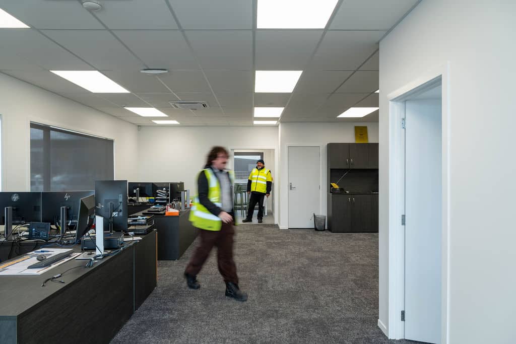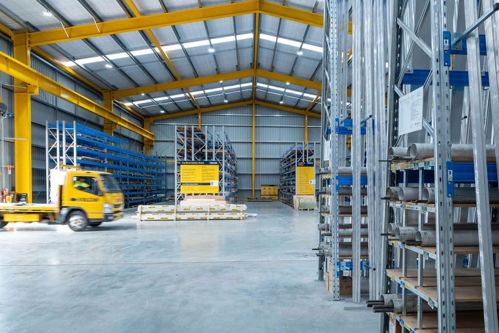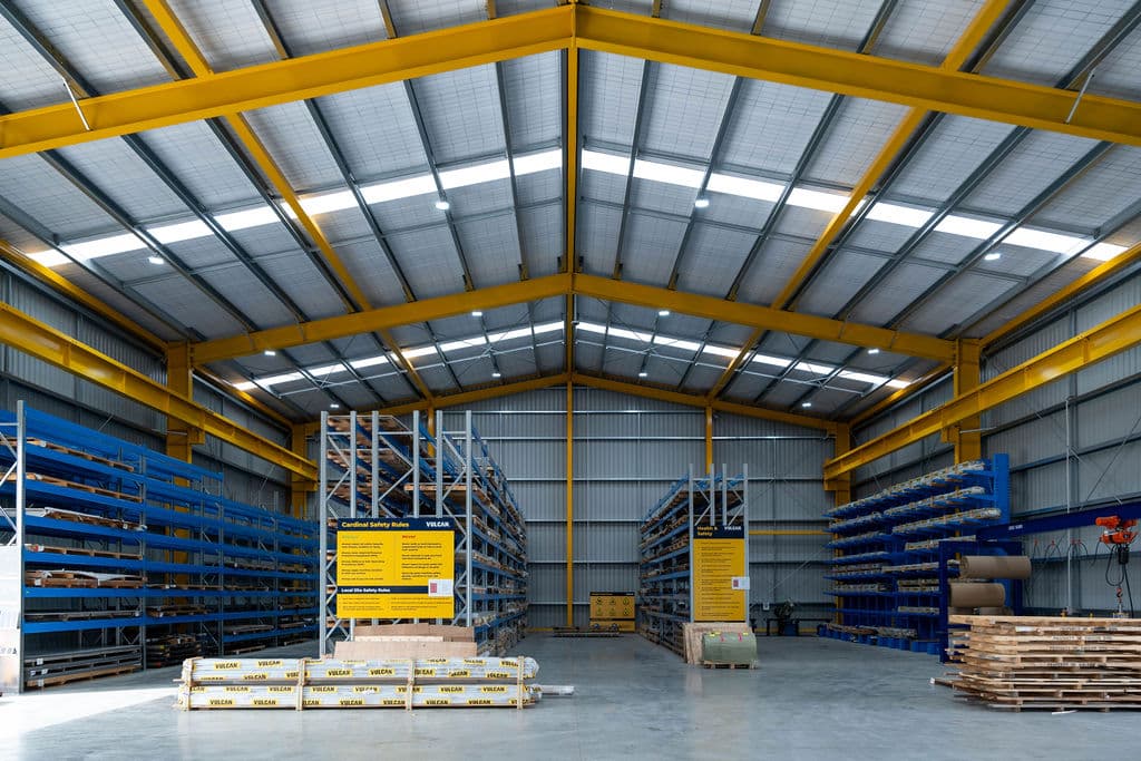 The warehouse structure uses efficient structural steel portal frames, creating a large column-free space ideal for Vulcan’s distribution requirements. Sustainability was a key focus, with low-carbon concrete and locally sourced materials helping to reduce the project’s overall embodied energy.